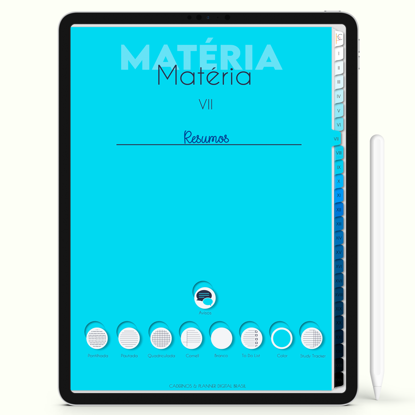 Nove opções de páginas ilimitadas: quadro de aviso, pontilhada, pautada, quadriculada, cornell, em branco, to do list study, color e study tracker para você ter liberdade em escrever na que mais lhe agradar.